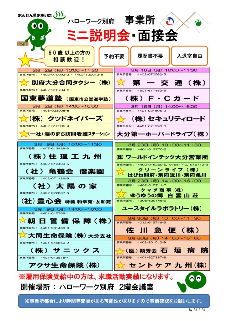 日時:3/30(月) 14:00~16:00 会場:ハローワーク別府
