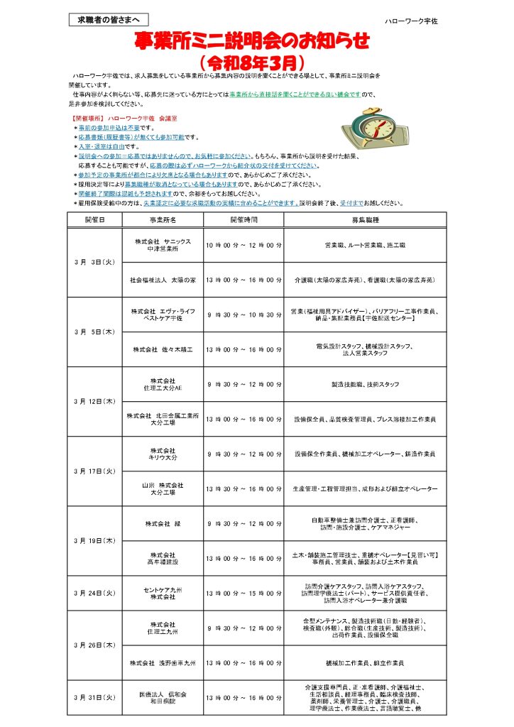 日時:3/24(火) 13:00~15:00 会場:ハローワーク宇佐