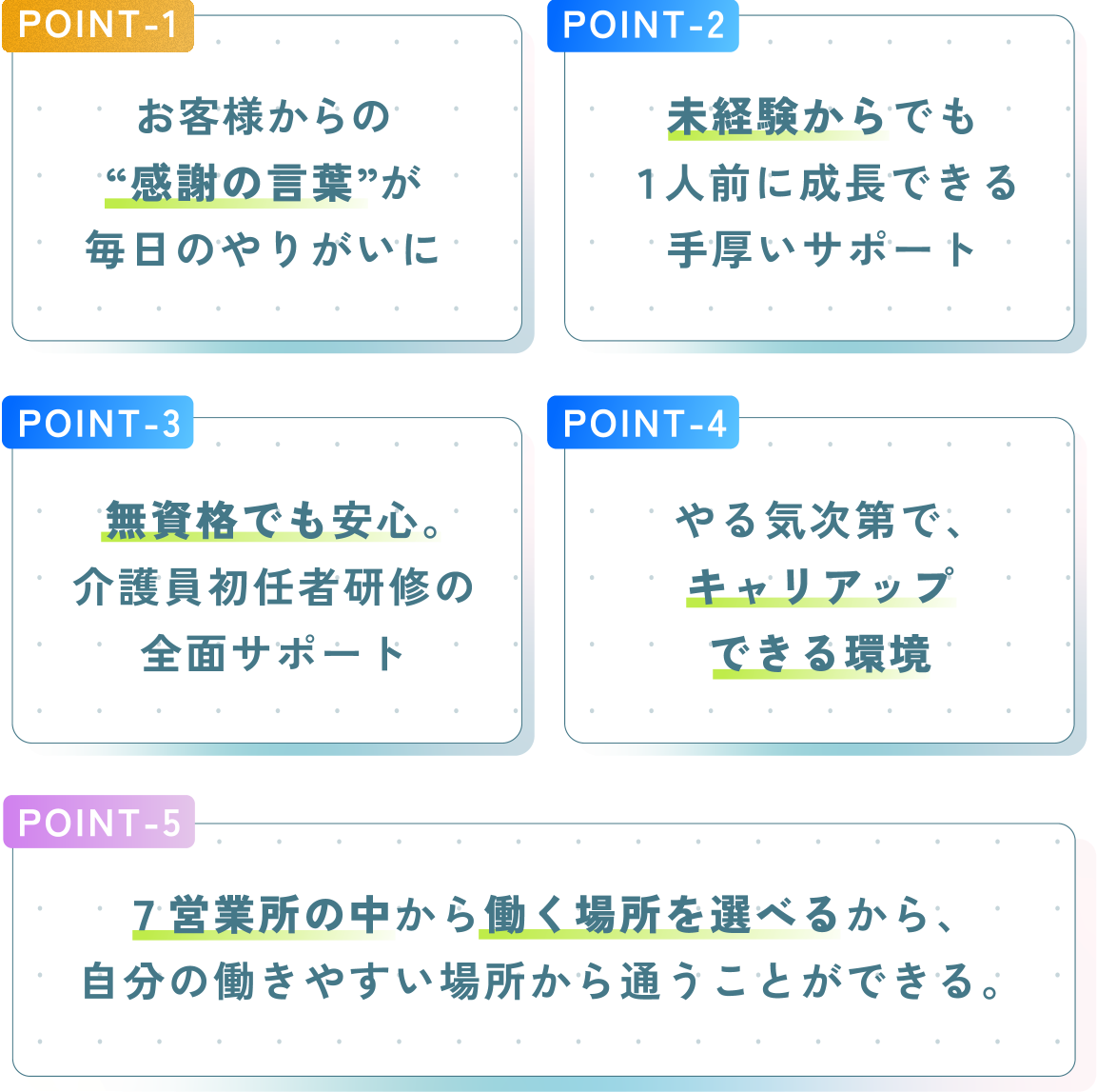 虹の街では、無資格の方でもステップアップしやすいように、介護員初任者研修のサポートに力を入れています。