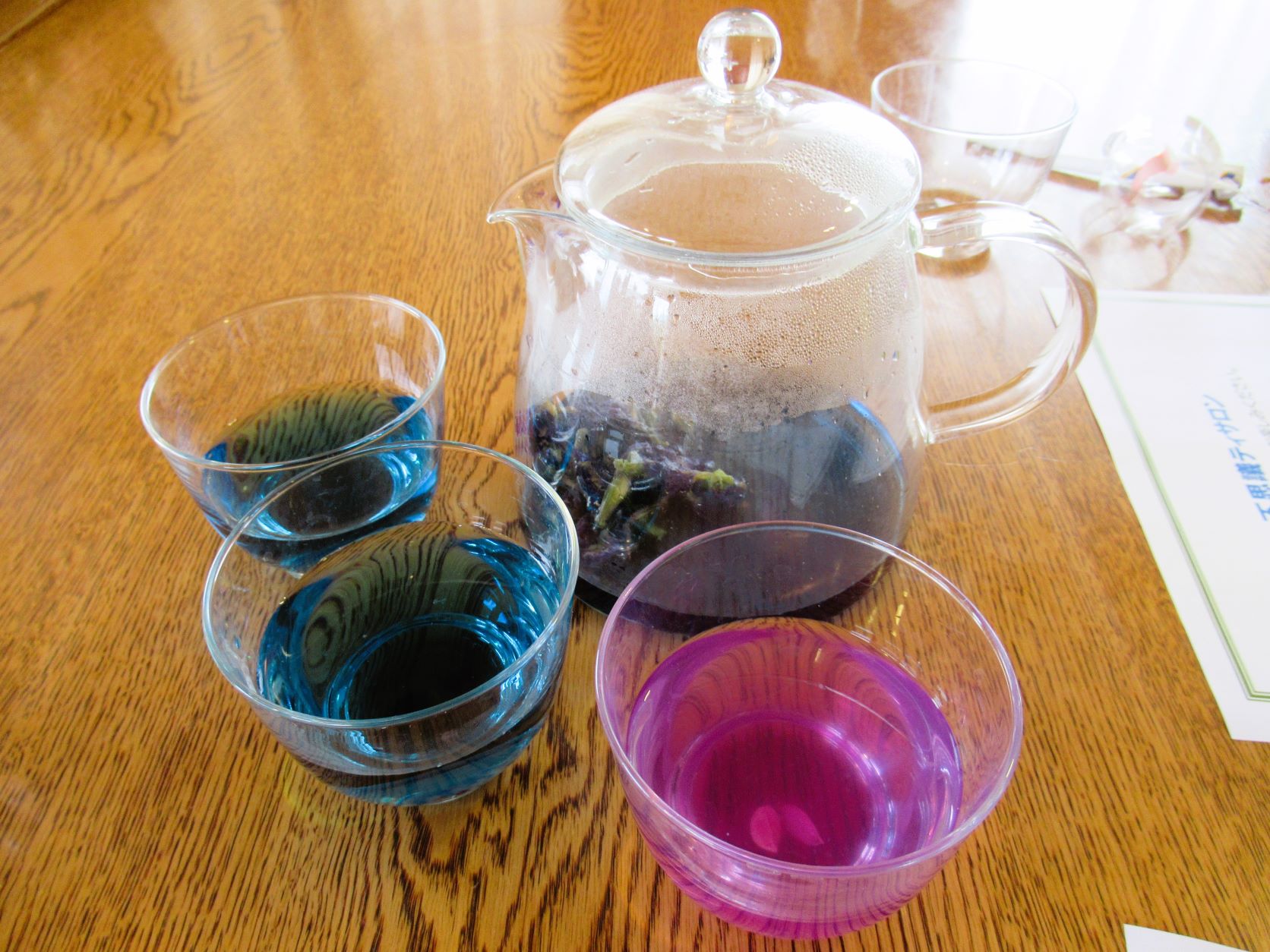 「バタフライピー」という青い花を咲かせるマメ科の植物を煮出すと、 お湯が鮮やかな青色になります。