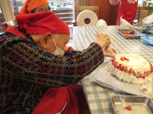 スポンジは厨房スタッフが作りましたが、苺を切って生クリームと一緒にデコレーションして