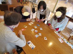 かるたでは、スタッフが読み札を読み終わる前に「はいっ!!」と絵札を取り
