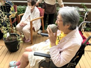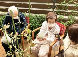 収穫したメロンを実際に持ってみて、「このメロンなんだかオモチャみたいね」