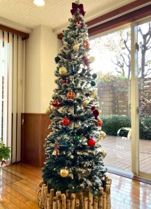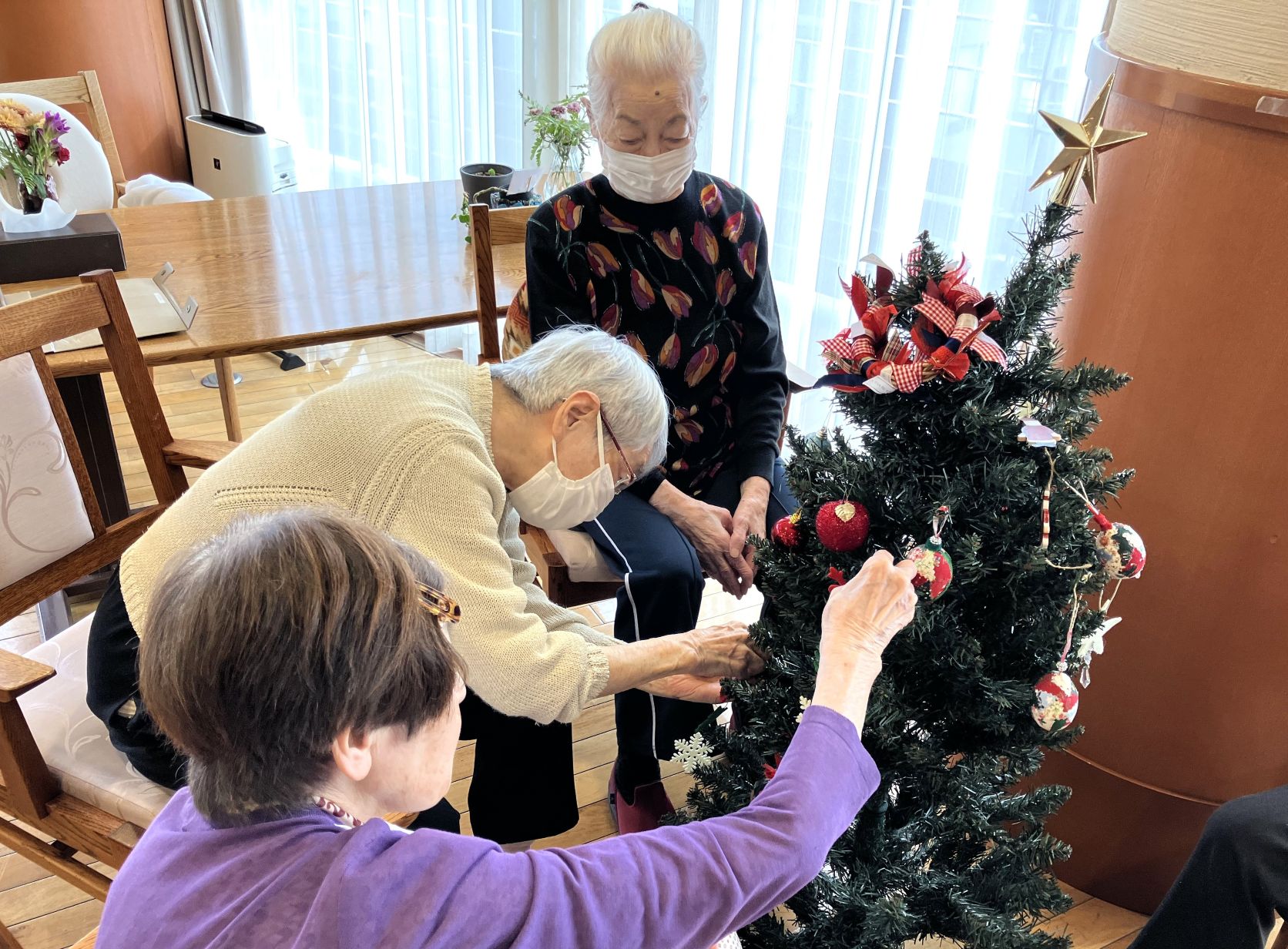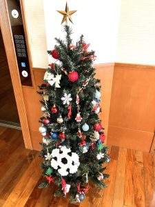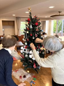 クリスマスまで あと1ヶ月程となり、お客様とツリーの飾り付けをしました。 今年は5階フロアが一番乗りです。 先に上の方を飾り、そのあとテーブルに乗せて下の方を飾りました。