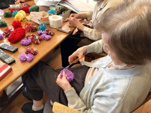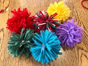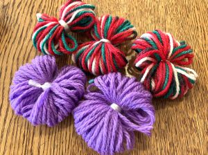 毛糸を束ねて左右を切って、毛糸のボンボリをたくさん作って・・・