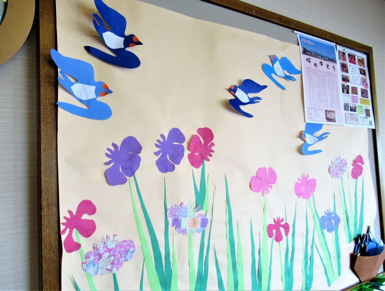 つばめとアヤメの作品は、5階のお客様が作りました。気持ちよさそうに飛んでいるつばめ達。巣には赤ちゃんもいます。