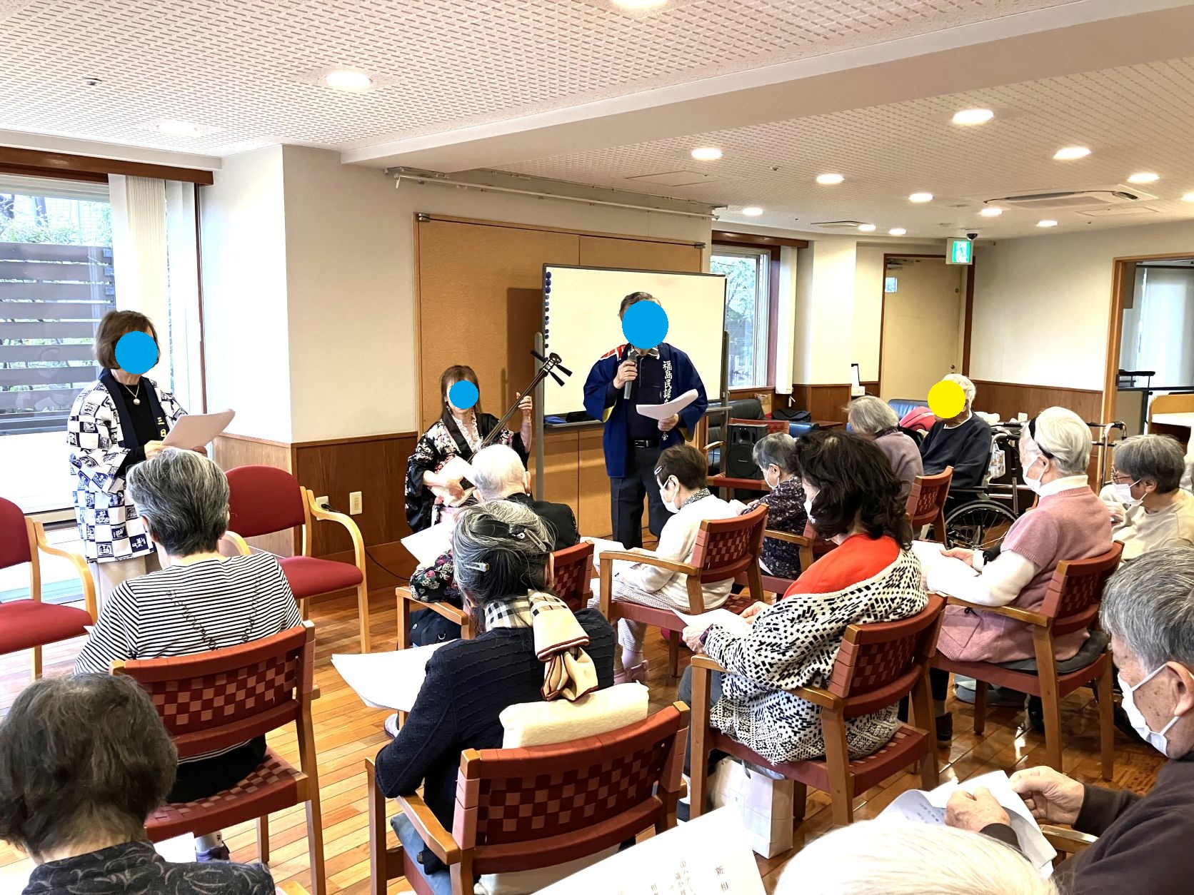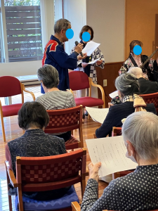 先月102歳の誕生日を迎えられたお客様をお祝いするため、 そのお客様の甥御様やお知り合いの方々が来設され、津軽三味線や 歌を披露してくださいました。