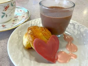 今年のバレンタインデーのおやつは・・・ サクッモフッとしたクロワッサンと ホットチョコレートをご用意しました。 ルビーチョコもハート型にして添えています。