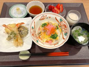 昼食は今年も豪華なちらし寿司や天ぷらをご用意しました。