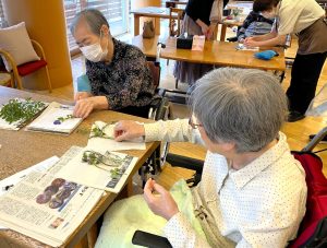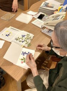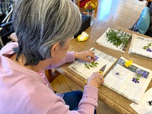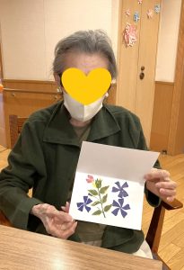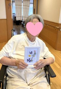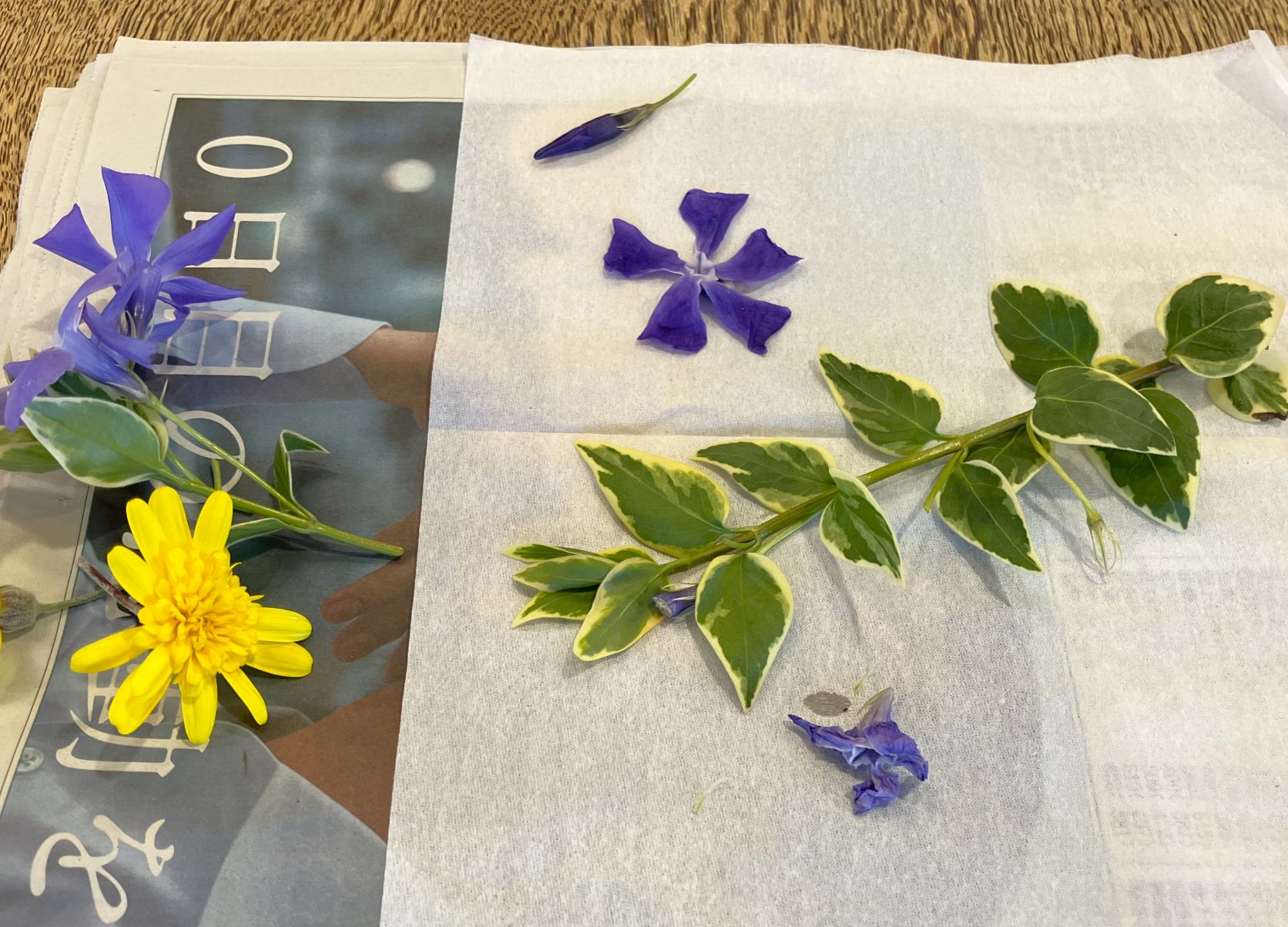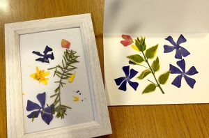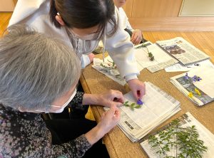 5階テラスに咲いているお花を摘んで、押し花を作りました。 緑の葉っぱとお花を組み合わせて並べて、新聞紙で挟んでその上に 重石を1週間ほど乗せたら・・・