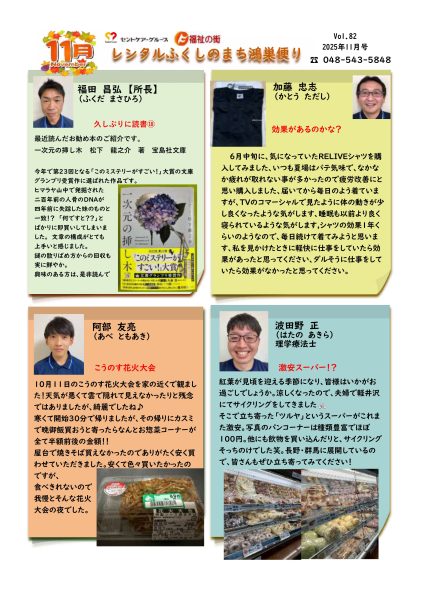 レンタルふくしのまち鴻巣 2025年11月号 2025.11.17 レンタル|鴻巣 福祉用具貸与・販売 この記事のタイトルとURLをコピーする コピーしました レンタルふくしのまち鴻巣 2025年11月号 「レンタルふくしのまち鴻巣」営業担当の自己紹介になります。 福祉用具に関するご相談がございましたら、ご遠慮なくお声がけください。