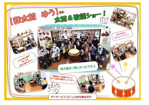 今回はお客様よりリクエストの多かった 「和太鼓ゆう」 の皆さまにお越しいただきました。 大きな和太鼓の音が身体中に響き、大迫力!! 何度見ても感動します。 和太鼓演奏の間には素敵な歌の時間で癒されます。 演奏の合間のお話も面白く、あっという間の一時間でした。 「次はいつ来るの?」既に待ち遠しいお客様からの声も… そんな楽しい思い出を通信にいたしましたのでお届けいたします。