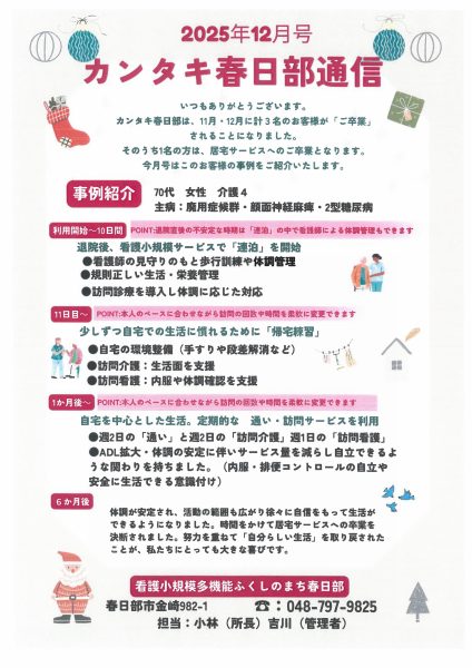「カンタキ春日部通信2025年12月号」では、居宅サービスへご卒業をされたお客様の事例をご紹介させていただきます。
