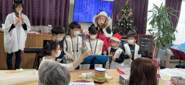 子ども合唱団はクリスティーヌのママお手製の衣装でとても映え、お客様から「かわいい~!」と声が上がり、写真撮影会が開かれるほどでした。 子ども合唱団が披露した曲目は、今年7月に亡くなられた 皆川おさむ氏 を追悼し「黒猫のタンゴ」、そして、リコーダー部と一緒に「冬景色」と「お正月」をミュージックベルで演奏し、会場にお集まりの皆さまを魅了しました♡