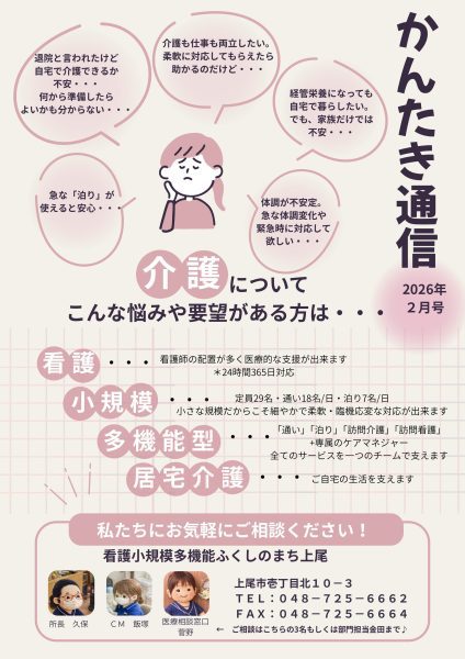 「家族が退院して家に帰ってきた時、どう介護すればいいのか?」「一人での介護は不安」そんな時は、ぜひ「看護小規模多機能ふくしのまち上尾」にご相談下さい。あなたの悩みを解決する手助けをいたします!